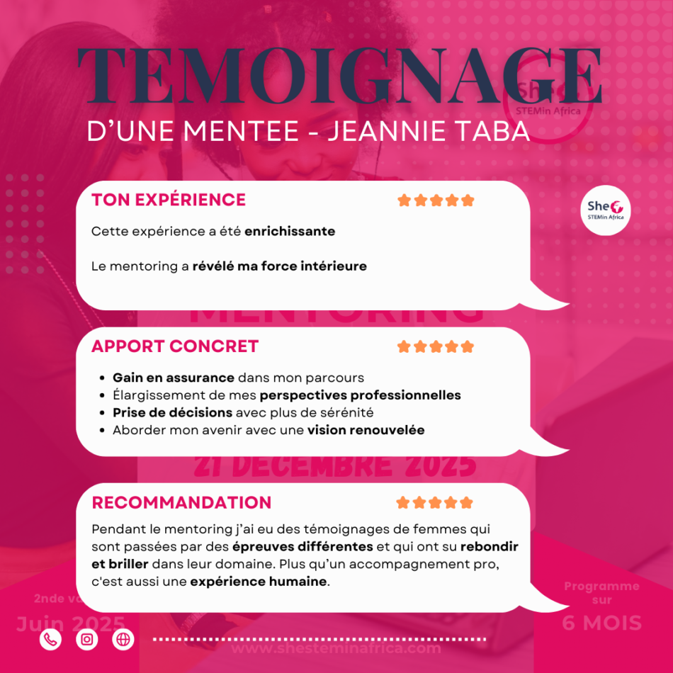 Témoignage – 3ᵉ cohorte de notre programme de mentoring (réservé aux membres adhérentes) Quand Jeannie Taba rejoint notre programme de mentoring, elle porte avec elle des questions que tant de jeunes femmes scientifiques connaissent bien : où vais-je ? Suis-je … Read More